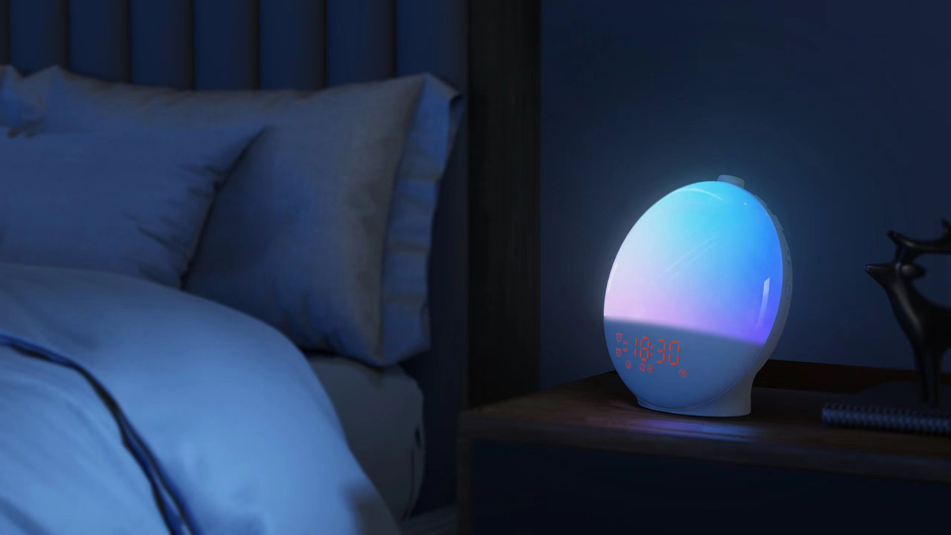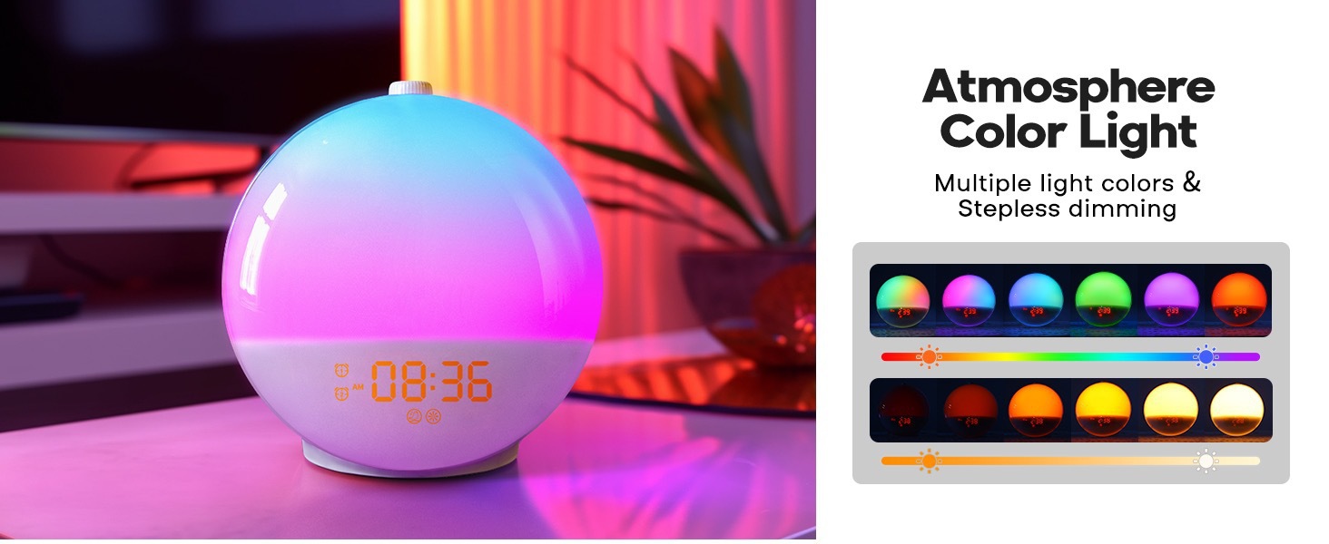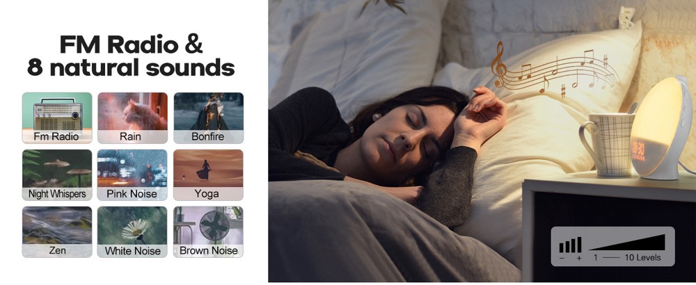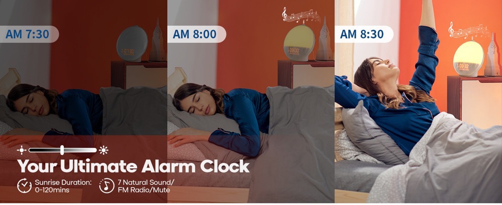 Sunrise Simulation: Gradually brightens from 10% to 100% over 10-30 minutes before alarm time, mimicking natural sunrise for gentle waking.